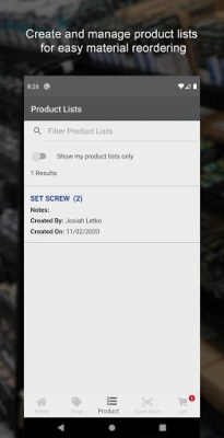 • Find products • View real-time price and availability • View active shipments • Place orders and track their status • Create lists of frequently ordered products • Find your local branch • Scan UPC barcodes • Quickly create orders using the quick scan • Register for an account